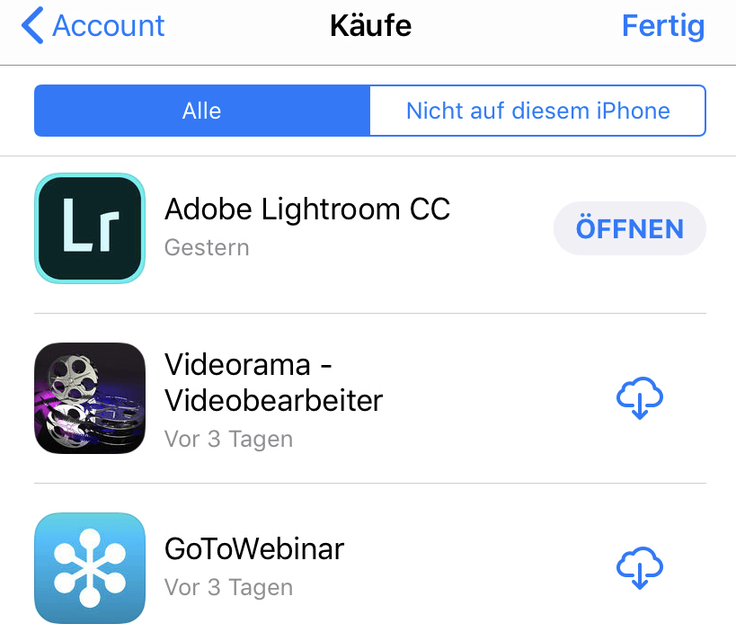 Tipp: Wenn Sie Mitglied einer Familiengruppe sind, können Sie nach dem Tippen auf „Gekauft“ auf dem nächsten Bildschirm auf einen Namen tippen, um die Apps zu installieren, die Ihre Familie gekauft hat.