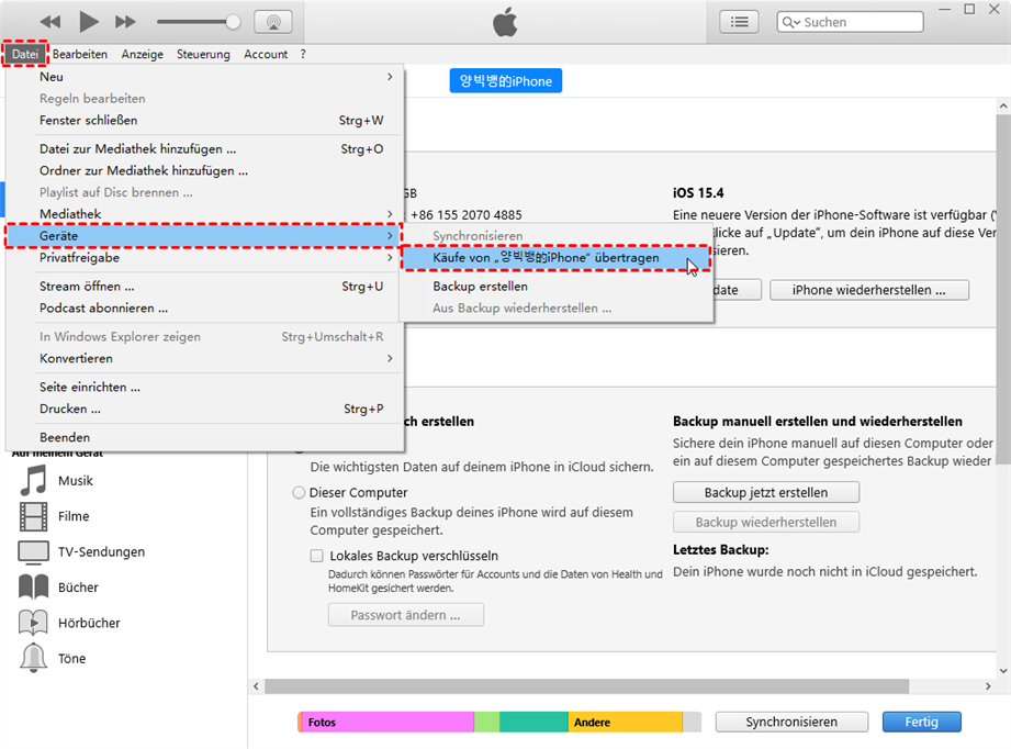 Schritt 3. Klicken Sie auf Datei. Tippen Sie auf Geräte, wählen Sie Käufe von [Name Ihres iPhones] übertragen. Trennen Sie das iPhone und schließen das iPad an den Computer an.