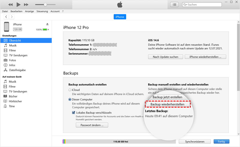 Apps wurden nicht auf neues iPhone übertragen? Wenn die oberen Lösungen nicht gehen, versuchen Sie die Wiederherstellung aus einem iTunes- oder iCloud-Backup. So stellen Sie Ihr iPhone aus einem iTunes-Backup wieder her (hier nehme ich iTunes-Backup als Beispiel).