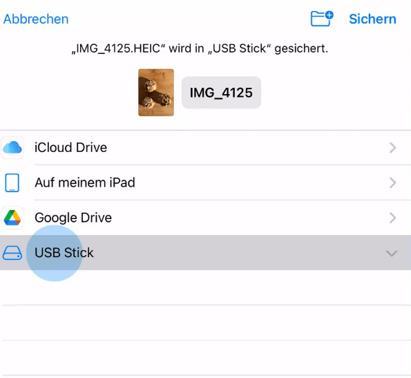 3. Tippen Sie auf Ihr USB Stick > Wählen Sie einen Ordner zum Speichern Ihrer Bilder > Tippen Sie auf Sichern.