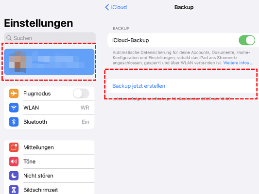 Schritt 2. Gehen Sie zu: Einstellungen > Ihren Namen > iCloud > iCloud-Backup. Aktivieren Sie iCloud-Backup und tippen auf Backup jetzt erstellen. Überprüfen Sie nach Abschluss der Sicherung die letzte Sicherungszeit, um sicherzustellen, dass die Sicherung erfolgreich war.