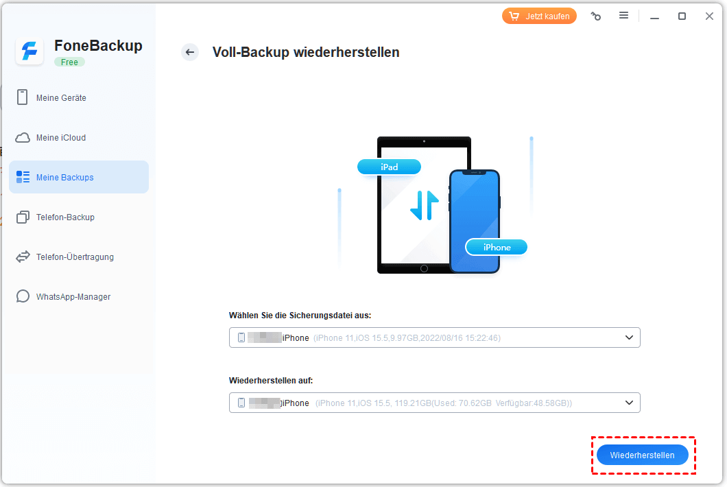 Warten Sie, bis der Sicherungsvorgang abgeschlossen ist. Nach der Aktualisierung oder der Behebung des Problems klicken Sie auf: Meine Backups > Wiederherstellung, um die Daten auf Ihrem iPhone wiederherzustellen.