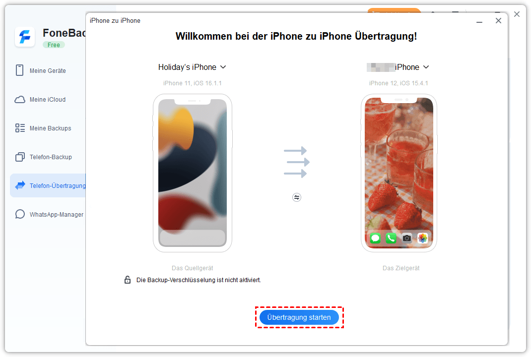 Wenn Sie außerdem viele bestimmte Elemente von einem iPad/iPhone auf ein anderes übertragen möchten, ist FoneBackup vielleicht die beste Wahl für Sie. Er überträgt nicht nur Daten zwischen iDevices und Computer, sondern leistet auch gute Arbeit bei der Sicherung Ihres iPhones und der Wiederherstellung bei Bedarf.