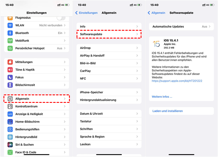 ● Aktualisieren Sie das iOS-Betriebssystem auf Ihrem iPhone, indem Sie zu: Einstellungen > Allgemein > Softwareupdate gehen. Wenn ein Update verfügbar ist, tippen Sie auf Laden und installieren.
