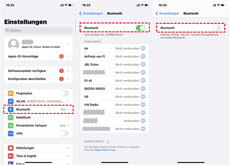 Schritt 1. Gehen Sie zu: Einstellungen > Tippen Sie auf Bluetooth, um Bluetooth auf Ihrem iPhone einzuschalten (oder öffnen Sie es im Kontrollzentrum).