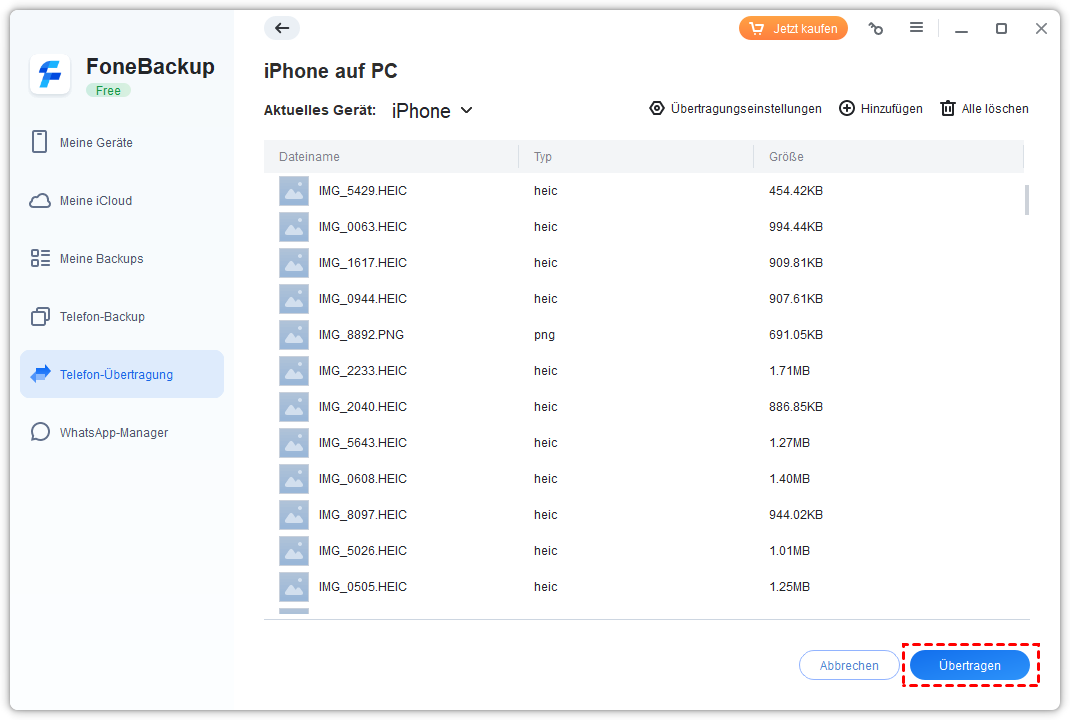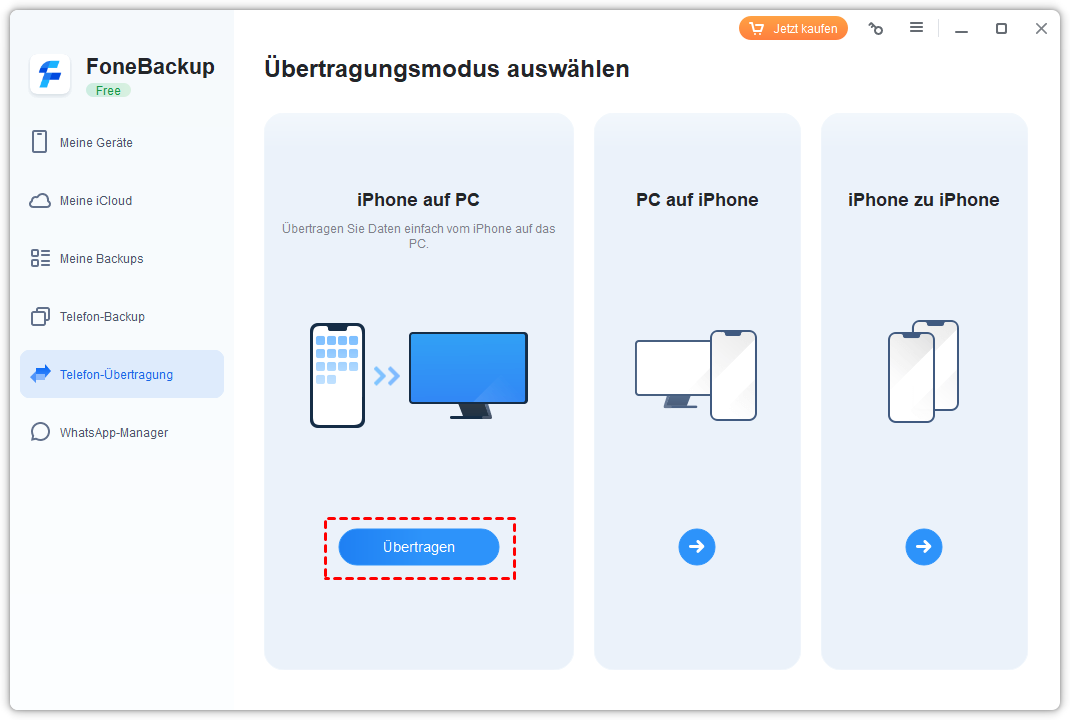 Schritt 2. Öffnen Sie dieses Tool und klicken auf: „Telefon-Übertragung“ > „iPhone auf PC“ und klicken auf „Übertragen“.