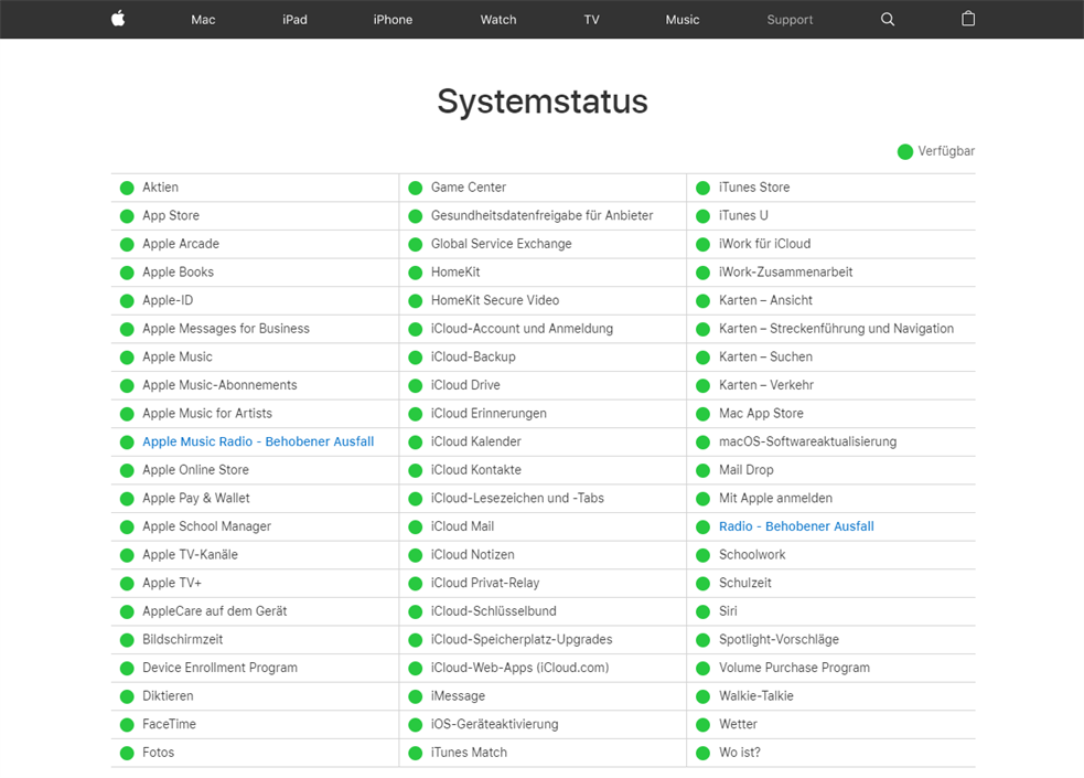 Jedes Mal, wenn bei der Verwendung von Apple-Geräten Probleme auftreten, müssen Sie zuerst den Apple-Systemstatus aufrufen, um zu prüfen, ob der Dienst nicht verfügbar ist. Wenn Sie ein grünes Licht neben Fotos sehen, können Sie zur nächsten Lösung übergehen. Oder Sie müssen einfach warten, bis Apple das Problem behoben hat.