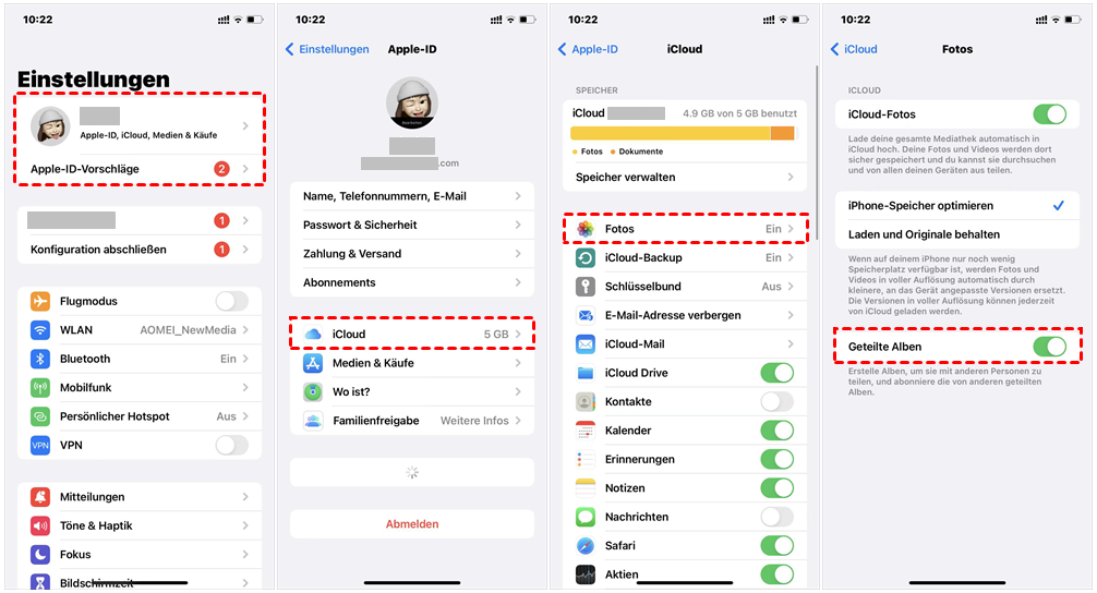 Wenn mit dem Apple Systemstatus oder Ihrer Netzwerkverbindung alles in Ordnung ist, schalten Sie die Funktion „Geteilte Alben“ einfach aus und aktivieren Sie sie wieder. Manchmal kann es vorkommen, dass das iPhone hängen bleibt, sodass einige Funktionen wie geteilte Alben vorübergehend nicht funktionieren. Öffnen Sie einfach Einstellungen > [Ihr Profil] > iCloud > Fotos, um die Funktion „Geteilte Alben“ zu suchen und sie aus- und wieder einzuschalten.