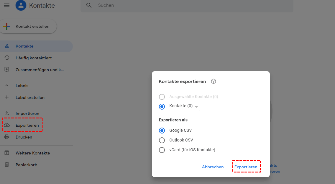 Schritt 2. Auf dem PC: Gehen Sie zu Ihrem Google-Konto > Melden Sie sich auf der Google-Kontoseite an > Klicken Sie auf „Exportieren“ > Klicken Sie auf „Kontakte“.