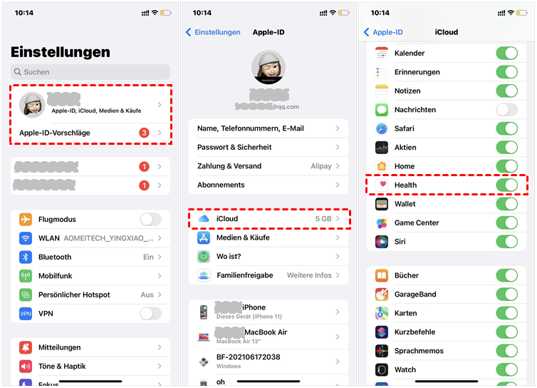- Prüfen Sie, ob Sie die Synchronisierung von Health Daten über iCloud aktiviert haben. Wenn ja, warten Sie einfach ein paar Tage, bis die Daten synchronisiert sind.