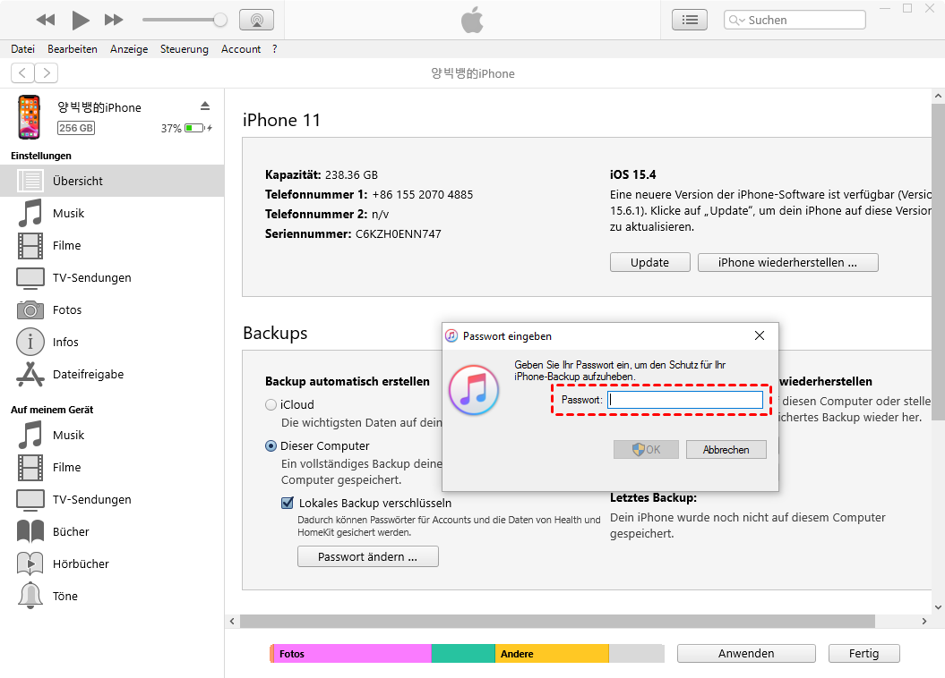 ● Bitte notieren Sie sich das Passwort für die Verschlüsselung des Backups oder bewahren Sie es an einem sicheren Ort auf. Ohne dieses Kennwort können Sie nicht aus dem Backup wiederherstellen.