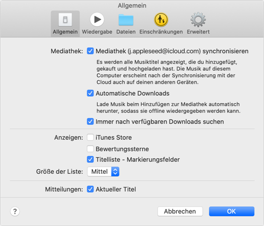 In iTunes: Klicken Sie auf „Bearbeiten“ > Wählen Sie „Einstellungen...“ > Klicken Sie auf „Allgemein“ > Aktivieren Sie das Kontrollkästchen neben „iCloud-MusikMediathek“, um sie zu aktivieren > Bestätigen Sie mit „OK“.