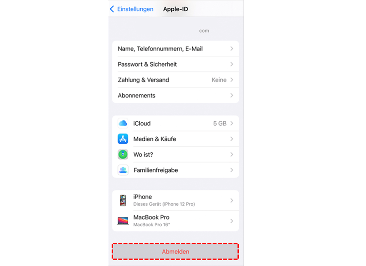 Schritt 1. Melden Sie sich zunächst bei Ihrem iCloud-Konto ab und dann wieder an. Gehen Sie zu Einstellungen und [Ihr Name] > Scrollen Sie nach unten und tippen auf Abmelden.