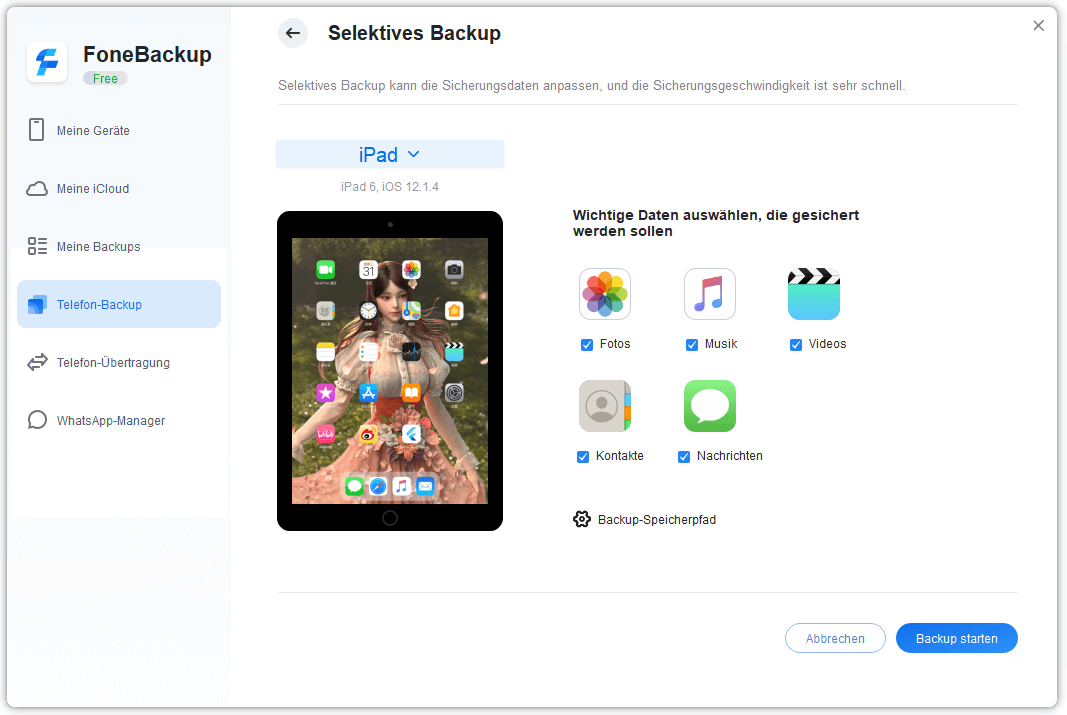Schritt 1. Führen Sie AOMEI FoneBackup aus > verbinden Sie Ihr iPad > wählen Sie „Telefon-Backup“ > „Selektives Backup“ > „Backup starten“ aus.