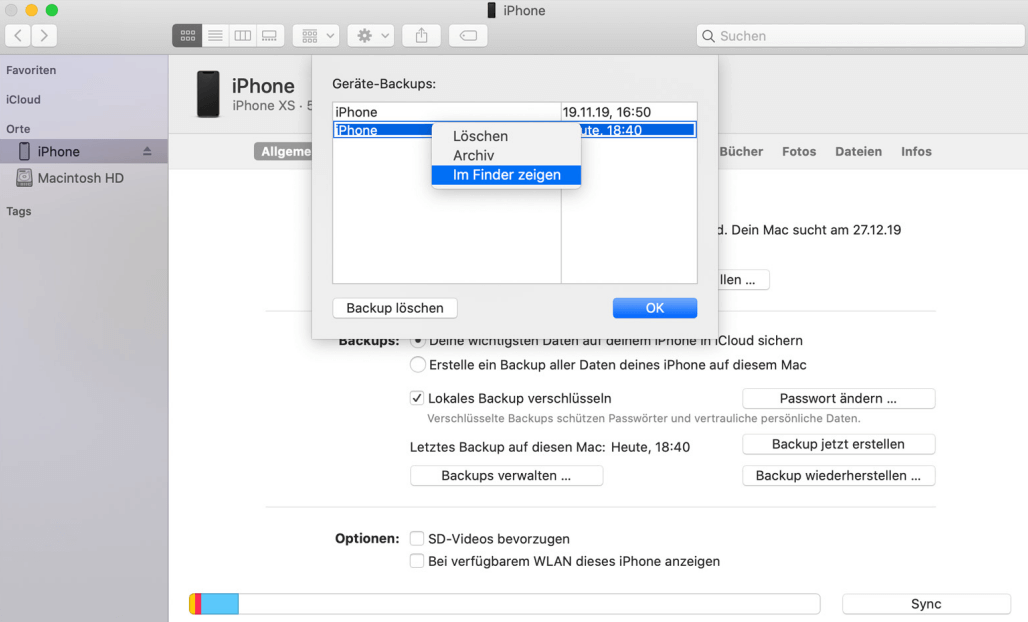 → Suchen Sie das bestimmte Backup: Öffnen Sie iTunes > Klicken Sie in der Menüleiste auf iTunes und wählen Einstellungen > Klicken Sie auf Geräte > Klicken Sie bei gedrückter Ctrl-Taste auf Backup und wählen Im Finder anzeigen.