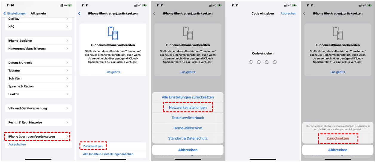 Auf dem iPad oder iPhone gehen Sie zu: Einstellungen > Allgemein > iPhone übertragen/zurücksetzen > Zurücksetzen > Netzwerkeinstellungen. Danach geben Sie den Passcode ein und klicken auf Zurücksetzen. Nach der Zurücksetzung geben Sie WLAN-Passwort erneut ein.