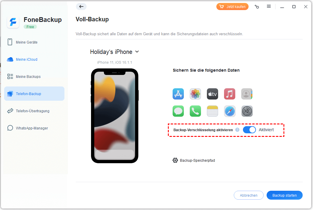 Schritt 3. Wenn Sie private Dateien wie Fitnessaufzeichnungen, Gesundheitszustand und Schlüsselbund sichern, aktivieren Sie Backup-Verschlüsselung > Wählen Sie einen Backup-Speicherpfad aus > Tippen Sie auf Backup starten und warten Sie, bis sie abgeschlossen ist.
