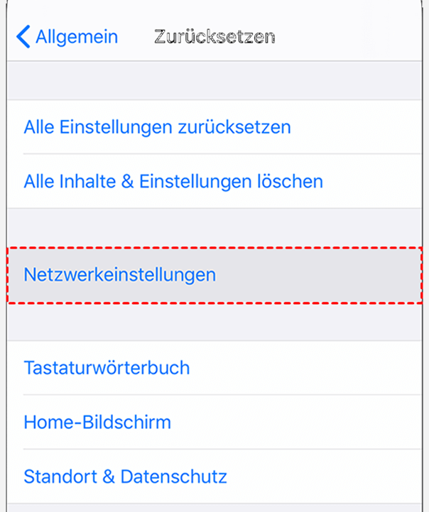 Die unbekannten Netzwerkprobleme führen dazu, dass iPhone Übertragung vorbreiten hängt. Sie sollen die Netzwerkeinstellungen zurücksetzen. Gehen Sie zu: Einstellungen > Allgemein > Zurücksetzen > Netzwerkeinstellungen.