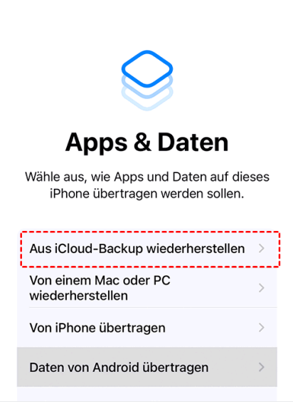 Wenn Sie Daten mit iCloud auf iPhone übertragen möchten, schalten Sie Ihr neues iPhone ein > Folgen Sie den Schritten, bis Sie Apps & Daten sehen > Wählen Sie Aus iCloud-Backup wiederherstellen.