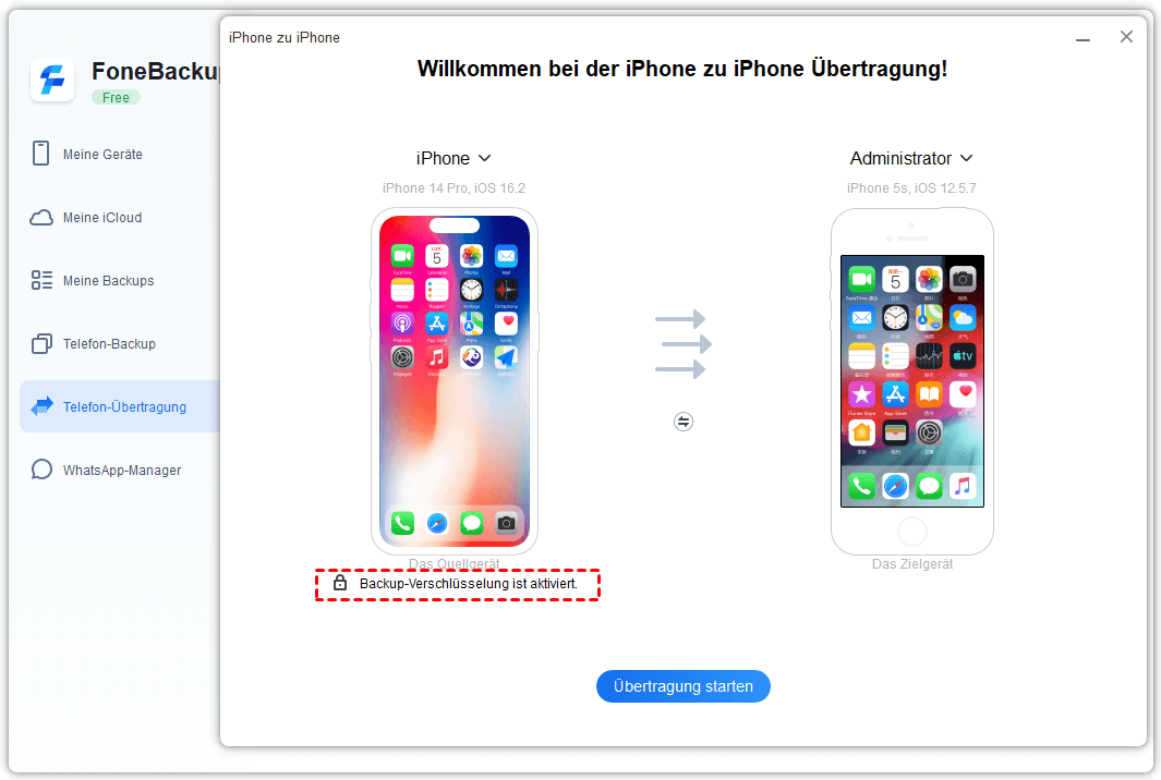 Wenn Schnellstart oder „Auf iOS übertragen“ nicht gut laufen, können Sie die professionelle Software namens AOMEI FoneBackup testen. Damit übertragen Sie Ihre Daten mit wenigen Klicks direkt von iPhone auf iPhone. Unabhängig von dem Netzwerk oder der Entfernung führt die Übertragung mit superschneller Geschwindigkeit.