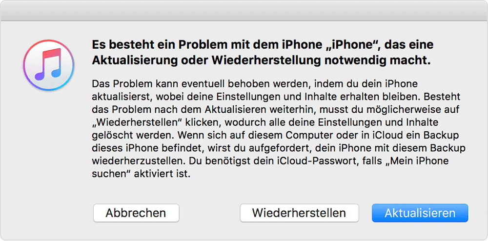 ✍ Hinweis: Wenn Sie „Aktualisieren“ wählen, wird iTunes versuchen, iOS neu zu installieren, ohne dass Daten verloren gehen. Wenn „Aktualisieren“ den Fehler nicht beheben konnte, können Sie Schritt 2 wiederholen, um erneut in den Wiederherstellungsmodus zu gelangen, und dann „Wiederherstellen“ wählen. Dadurch werden alle Daten auf dem iPhone gelöscht.