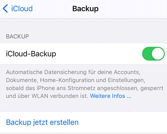 Gehen Sie zu Einstellungen > Tippen Sie auf Ihren Namen > Wählen Sie iCloud > Aktivieren Sie iCloud-Backup > Tippen Sie auf Backup jetzt erstellen. Das Backup der iPhone-Inhalte, einschließlich Ihrer Kontakte, wird gestartet.