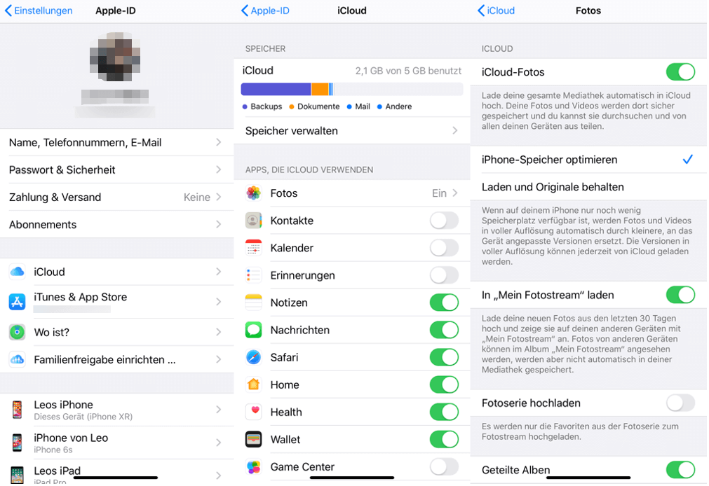Sie möchten Ihre iCloud-Fotos trotzdem auf dem iPhone behalten. Es gibt auch eine andere Möglichkeit, Speicherplatz zu sparen. Gehen Sie zu iPhone Einstellungen > [Ihr Profil] > iCloud > Fotos, und aktivieren Sie die Option iPhone-Speicher optimieren.