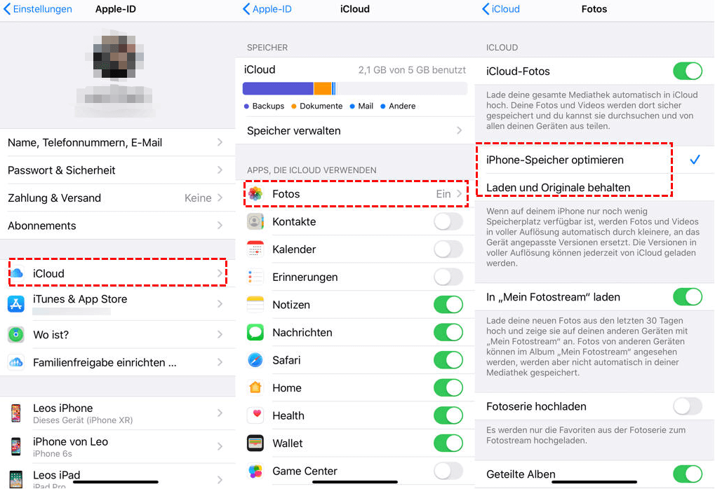 Wenn Sie iPhone Fotos aktiviert haben, kann der Prozess des Neuladens von Videos aus verschiedenen Gründen beschädigt werden. Gehen Sie daher auf dem iPhone zu Einstellungen > Tippen Sie auf [Ihr Name] > Wählen Sie iCloud > Klicken Sie auf Fotos > Wählen Sie Laden und Originale behalten, um Ihre Videos wiederherzustellen.