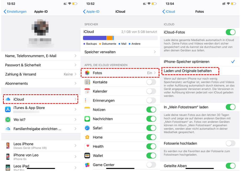 Gehen Sie zu iPhone: Einstellungen > [Ihr Name] > iCloud > Fotos, dann wählen Sie Laden und Originale behalten.