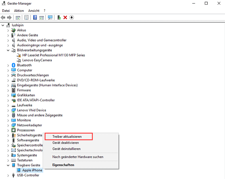 5. iPhone-Treiber löschen: iPhone wird im Explorer nicht mehr erkannt? Der Treiber wird zum Verbinden des Geräts benötigt und ermöglicht den Zugriff auf den internen iPhone-Speicher. Wenn etwas mit dem Treiber schiefgelaufen ist, können Sie ihn löschen und er wird beim nächsten Mal automatisch neu installiert.