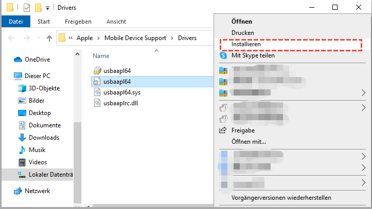 4. Klicken Sie mit der rechten Maustaste auf usbaapl64.inf oder usbaapl.inf > Wählen Sie die Option Installieren, um sie zu erstellen.
