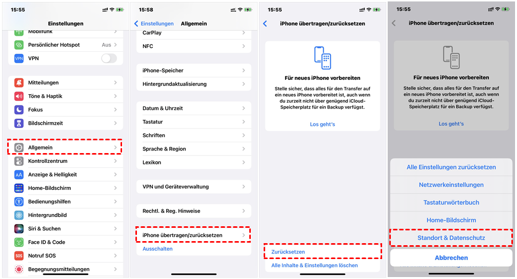 Schritt 2. Navigieren Sie zu Allgemein > iPhone übertragen/zurücksetzen > Zurücksetzen > Standort & Datenschutz. Geben Sie Ihr Passwort ein, wenn Sie danach gefragt werden, und beginnen Sie mit dem Zurücksetzen.