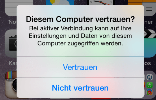 Wenn dies der Fall ist, können Sie die Verbindung zwischen Ihrem iPhone und dem Computer trennen und erneut herstellen. Wenn Sie ein solches Fenster sehen, denken Sie daran, die Option „Vertrauen“ zu wählen.