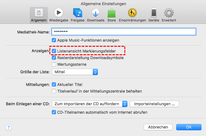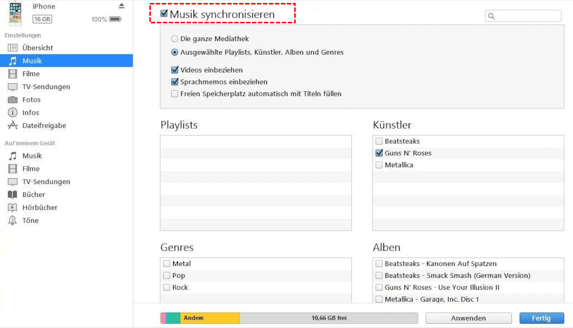 Wenn Sie die Lieder nicht vom Computer auswählen können, muss iTunes die Berechtigung zum Synchronisieren von Musik erteilt werden.