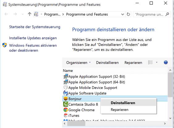 3. Deinstallieren Sie Apple Software Update, Apple Mobile Device Support, Bonjour, Apple Application Support nacheinander.