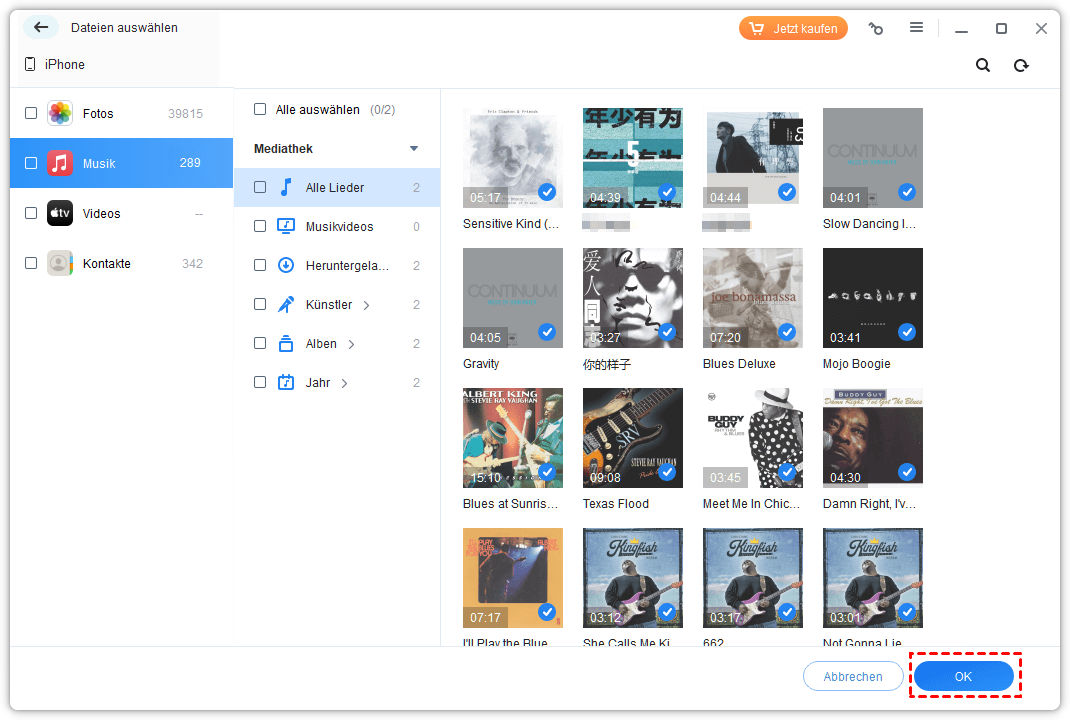 Schritt 3. Klicken Sie das Musiksymbol, um die zu sichernden Titel auszuwählen > Wählen Sie die Titel, die Sie auf den Computer übertragen wollen, und klicken auf OK.