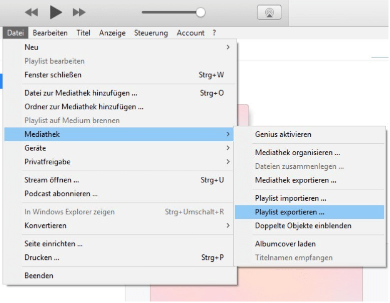 Schritt 2. Öffnen Sie iTunes > Wählen Sie die Wiedergabeliste aus, die Sie übertragen möchten > Klicken Sie auf Datei > Tippen Sie auf Mediathek > Wählen Sie Playlist exportieren.