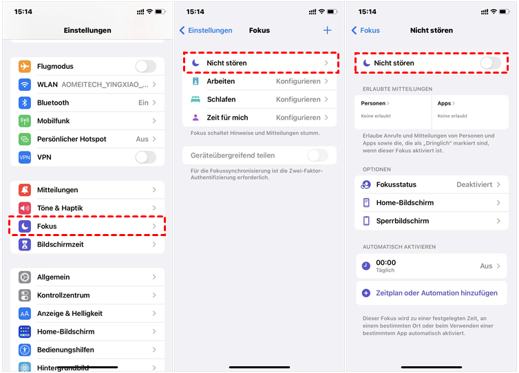 Um DND zu deaktivieren, müssen Sie nur zu den iPhone-Einstellungen gehen > Fokus > „Nicht stören“ auswählen und es dann ausschalten. Sie können es auch in der Systemsteuerung in Lösung 1 finden.