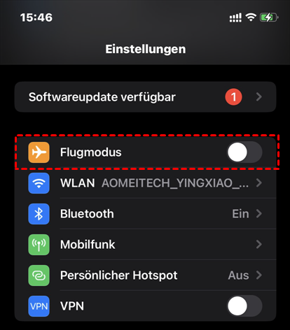 Wenn der Flugzeugmodus aktiviert ist, können Sie weder das Mobilfunknetz noch Wi-Fi nutzen und auch keine Anrufe tätigen oder empfangen. Sie können von der oberen rechten Ecke des Bildschirms nach unten wischen und den Flugmodus ausschalten.
