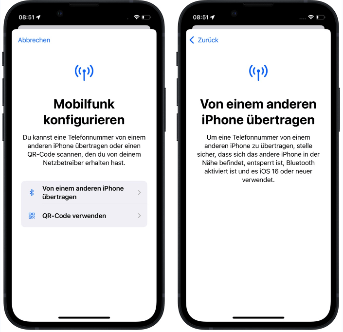 Schritt 3. Tippen Sie auf dem Bildschirm „Ihre Telefonnummer übertragen“ auf „Von einem anderen iPhone übertragen“ und tippen Sie auf dem neuen iPhone auf „SIM übertragen“.