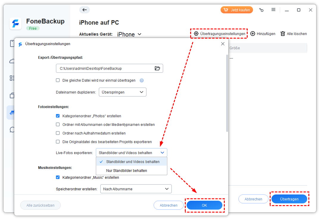 2. Wählen Sie unter Telefon-Übertragung die Option iPhone auf PC > Klicken Sie auf Übertragen.