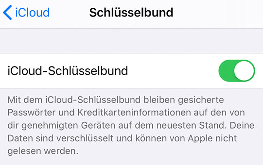 iCloud-Schlüsselbund speichert Ihre Kreditkartennummer, Benutzernamen und Passwörter in Safari, WLAN-Passwörter sowie Konten und Passwörter in anderen Apps.