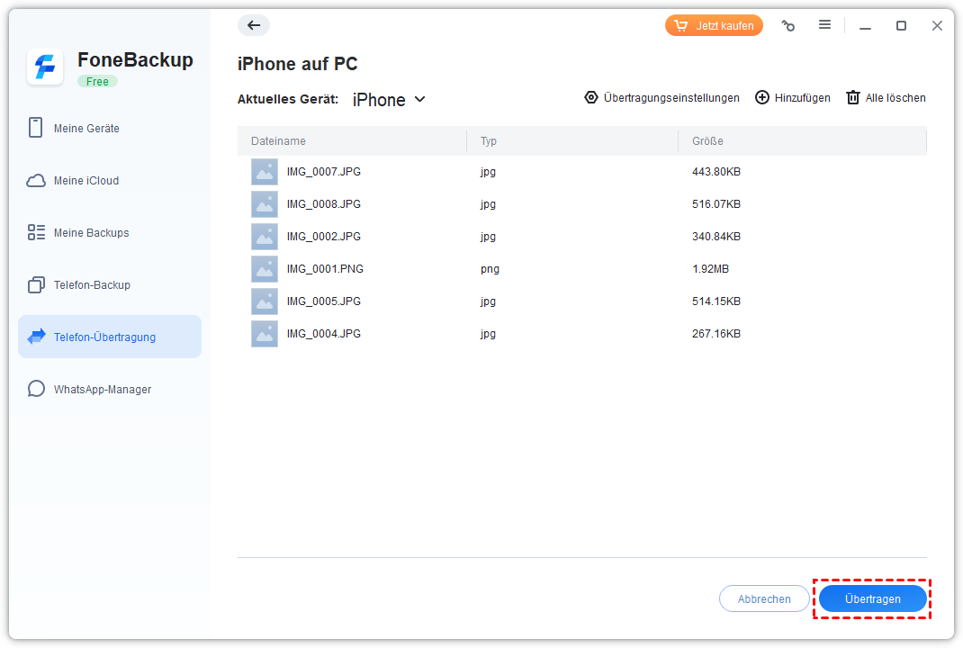 8. Klicken Sie auf Übertragen, um die Dateien auf Ihr neues iPhone zu importieren.