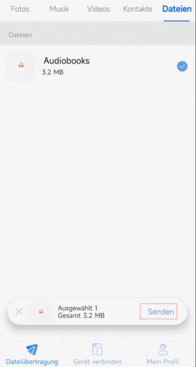 Schritt 3. Auf dem Quell-iPad: Gehen Sie zu Dateiübertragung > klicken Sie auf Dateien > klicken Sie auf das „+“-Symbol und wählen Sie die zu übertragenden Dateien aus > klicken Sie auf die Schaltfläche Senden.