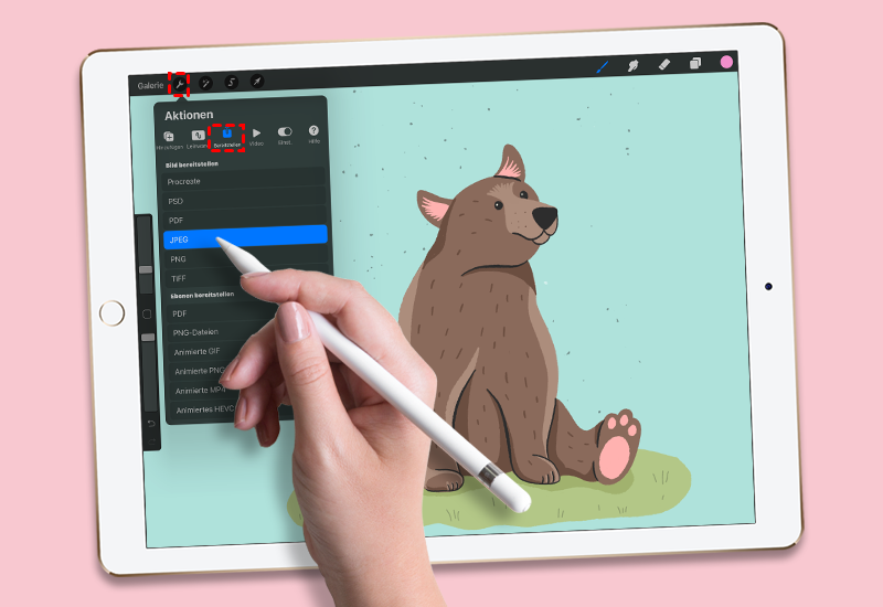 Schritt 1. Öffnen Sie Procreate > Sehen Sie sich die obere Symbolleiste in Procreate an > tippen Sie auf den Schraubenschlüssel ganz links, um das Bedienfeld „Aktionen“ zu öffnen > tippen Sie auf die Schaltfläche „Bereitstellen“.