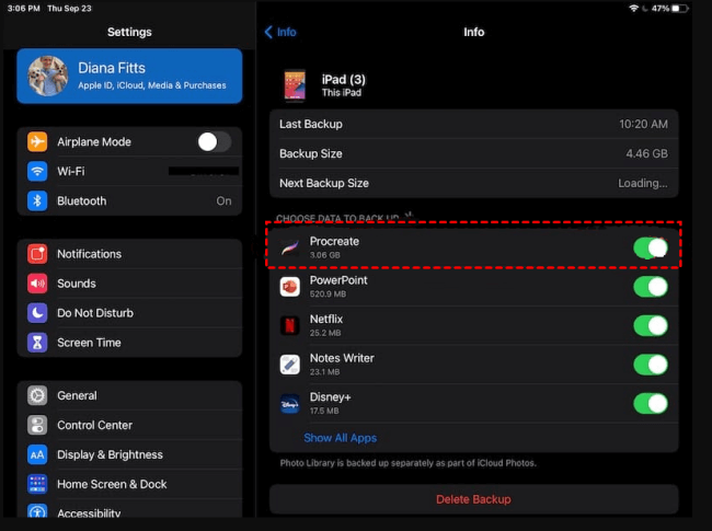 Klicken Sie auf Ihrem alten iPad auf „Einstellungen“ > tippen Sie auf Ihre Apple ID > wählen Sie „iCloud“ > wählen Sie die „Procreate-Dateien“, die Sie übertragen möchten > klicken Sie darauf, um sie einzeln zu aktivieren.