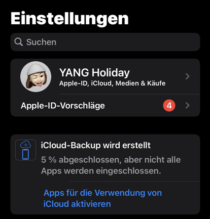 Sie können den Status Ihrem temporären iCloud-Backup unter Ihrem Namen in der App „Einstellungen“ sehen.