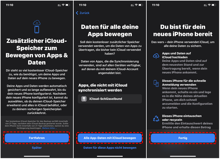 Mit dem temporären iCloud-Speicher können Sie fast alles auf das neue iPhone übertragen. Es kann jedoch lange dauern, bis die Übertragung abgeschlossen ist, wenn das Netzwerk schlecht ist. Bitte beachten Sie außerdem, dass die temporäre iCloud-Backup verschwindet. Wenn Ihnen Ihre Daten wichtig sind, können Sie AOMEI FoneBackup verwenden, um das iPhone auf dem Computer zu sichern.