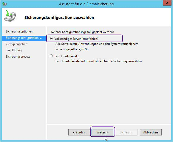 Schritt 2. In diesem Fenster ist ein Vollständiger Server-Backup empfehlenswert, klicken Sie darauf, und dann klicken Sie auf Weiter.