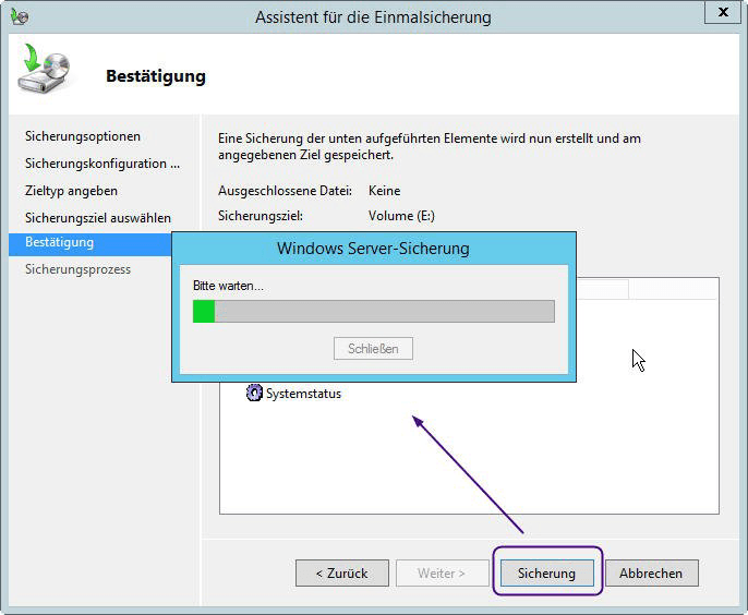 Schritt 5. Jetzt müssen Sie in diesem Fenster auf Sicherung klicken, um das Windows Server 2016 Backup zustarten.